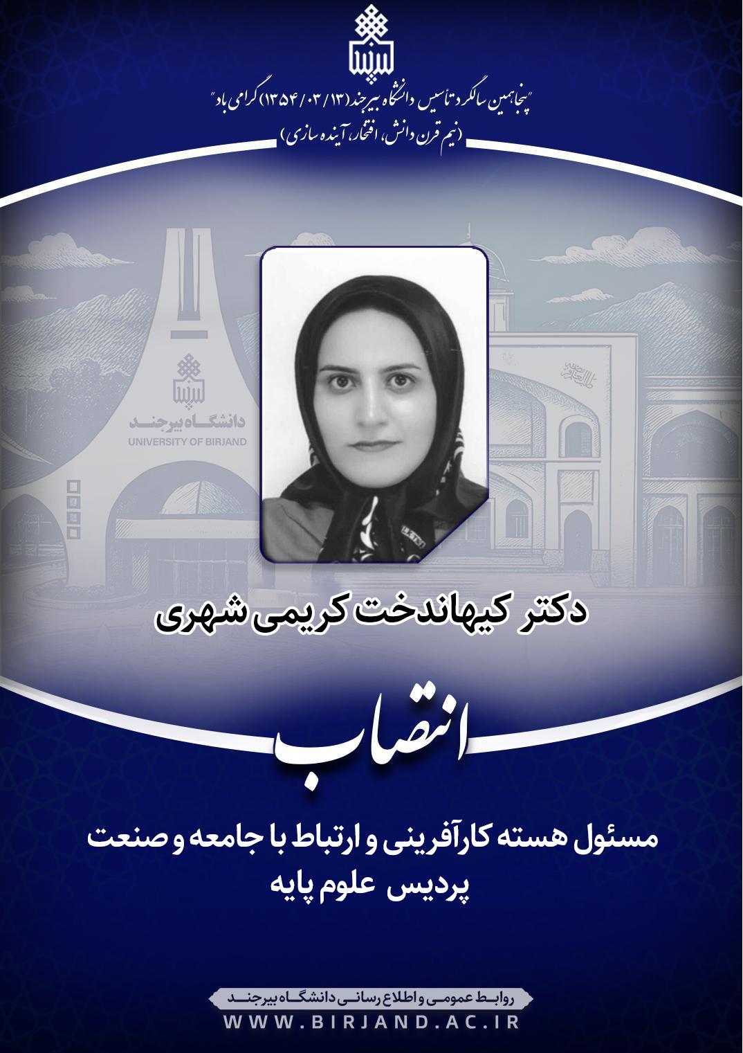براساس ابلاغی از سوی دکتر احمد خامسان، سرپرست دانشگاه بیرجند، دکتر کیهان‌دخت کریمی شهری، عضو هیأت علمی گروه آموزشی فیزیک به عنوان مسئول هسته کارآفرینی و ارتباط با جامعه و صنعت پردیس علوم پایه به مدت دوسال منصوب شد.