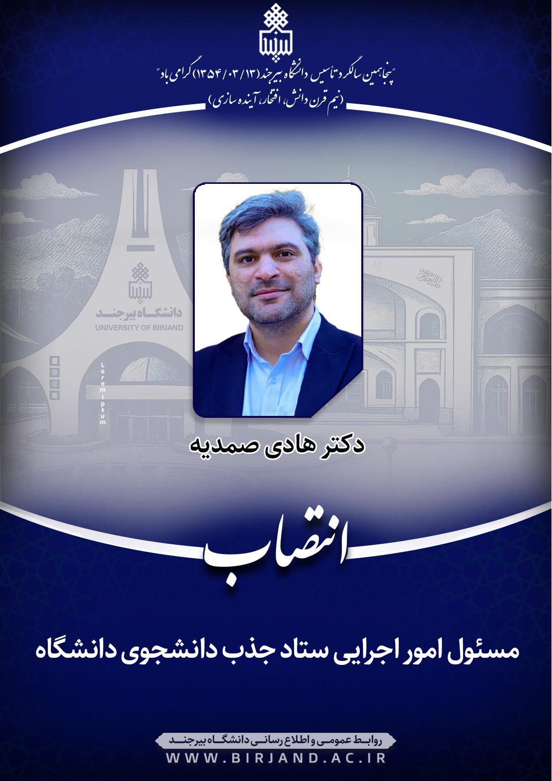 به گزارش روابط عمومی و اطلاعرسانی دانشگاه بیرجند، در این ابلاغ انتصاب خطاب به دکتر صمدیه آمده است؛ نظر به مراتب تعهد و شایستگیهای علمی و اجرایی جنابعالی و به استناد اساسنامه ستاد جذب دانشجوی دانشگاه (مصوب جلسـه 1400/02/11 هیأت رئیسه) به موجب این ابلاغ به عنوان «مسئول امور اجرایی» سـتاد منصوب میشوید. اطمینان دارم با اتکال به خداوند سبحان و بهره گیری از مشارکت و همفکری سایر اعضای شورای مرکزی ستاد جذب دانشجو منشأ خدمات ارزندهای در راستای اهداف و وظایف ستاد خواهید بود.