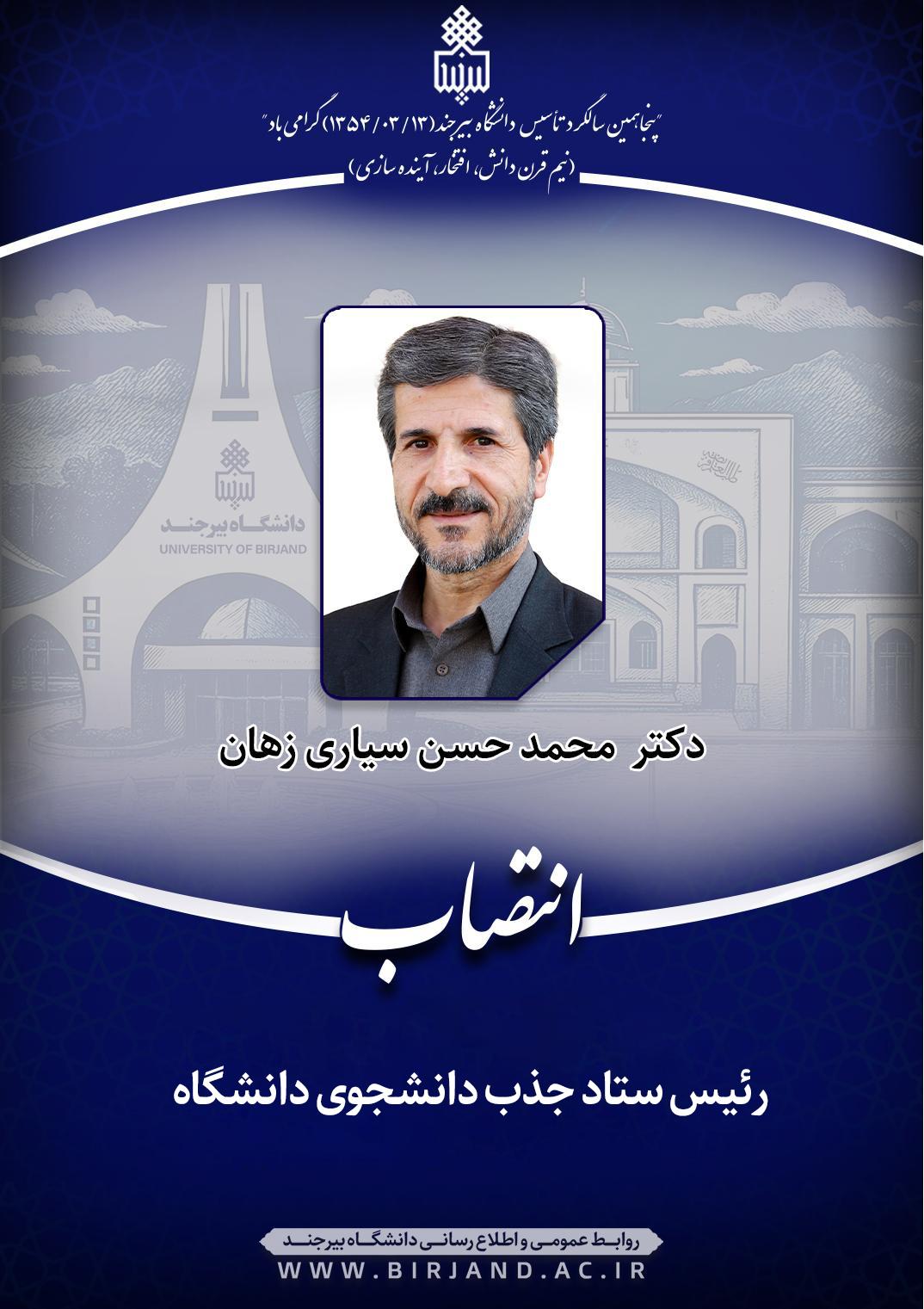 به گزارش روابط عمومی و اطلاعرسانی دانشگاه بیرجند، در این ابلاغ انتصاب آمده است؛ نظر به مراتب تعهد و شایستگیهای علمی و اجرایی جنابعالی و به اسـتناد اساسنامه ستاد جذب دانشجوی دانشگاه (مصوب جلسـه 1400/02/11 هیأت رئیسه) به موجب این ابلاغ به عنوان رئیس ستاد جذب دانشجو به مـدت دو سال منصوب میشوید. اطمینان دارم با اتکال به خداوند سبحان و بهرهگیری از مشارکت و همفکری سایر اعضای شورای مرکزی ستاد جذب دانشجو منشأ خدمات ارزندهای در راستای اهداف و وظایف ستاد خواهید بود.
