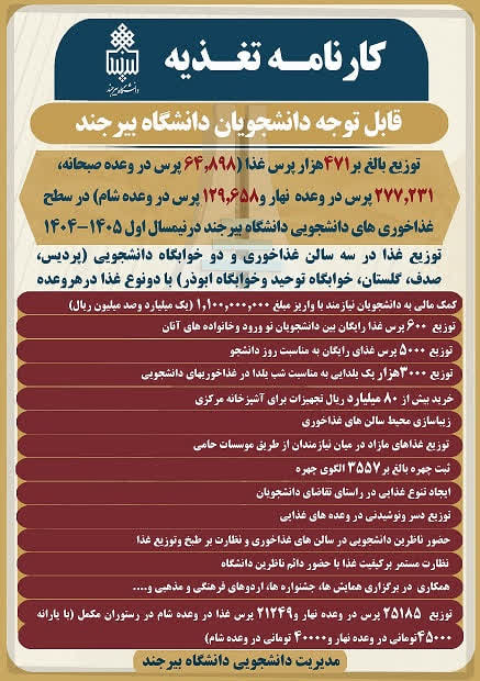 توزیع بیش از ۴۷۱ هزار پرس غذا در غذاخوری‌های دانشجویی دانشگاه بیرجند در نیمسال اول ۱۴۰۵–۱۴۰۴